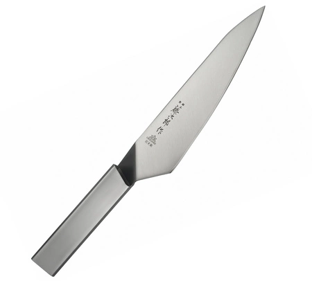 Vysoce kvalitní japonský nůž, určeno pro základní kuchyňské práce. Skvěle se hodí na sekání bylinek, krájení zeleniny a ovoce a na práci s menšími porcemi masa. Nůž má oboustranně vypouklý povrch a opouští továrnu ostrý jako břitva. Díky použití jednotný materiál je velmi odolný a snadno se udržuje. Takové řešení také pomáhá postarat se o hygiena na pracovišti. Zrcadlové leštění oceli zvyšuje její odolnost proti korozi a udržuje nůž déle ostrý.